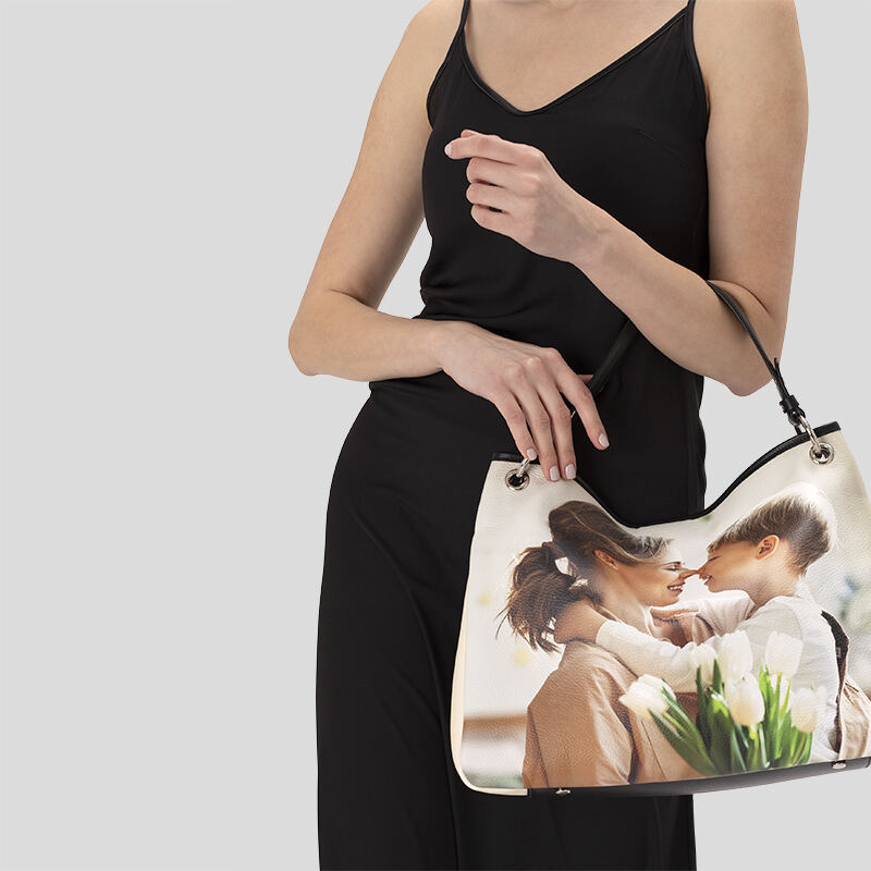 The Talbot bag is made of premium Nappa leather in your choice of a smooth or bubble texture. All of the accented bits, such as the base, top trim, closure tabs, and handle, are made of smooth black Nappa no matter which texture you select for the body of your bag. Your design will be printed on the custom made slouchy leather shoulder bag in a way that will be vibrant with bold colours and sharp details. You can use your own photos to design this bag or design one as a personalised photo gift for someone extra special. They'll get a kick out of knowing that the bag was designed and made specifically for them.