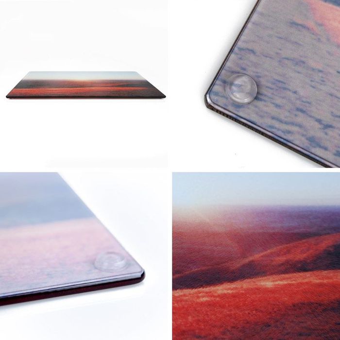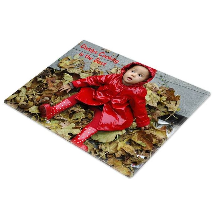 Our glass chopping board has mildly bumpy texture surface; a nice feature that will still wipe clean perfectly. This textured surface will refract light a little. They still look great, but some people think this surface can slightly distort the image. Therefore, we suggest not to use very small text or photo collages in your design, otherwise, these photo collage chopping boards make super popular glass photo gifts for giving to family and friends.