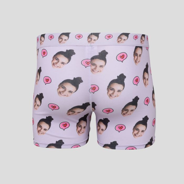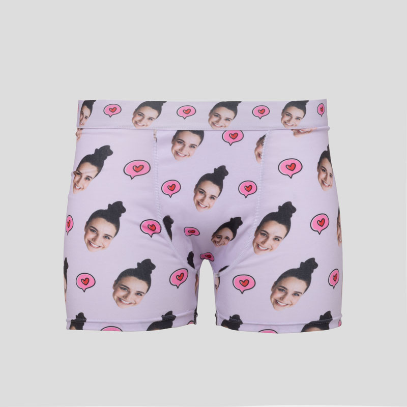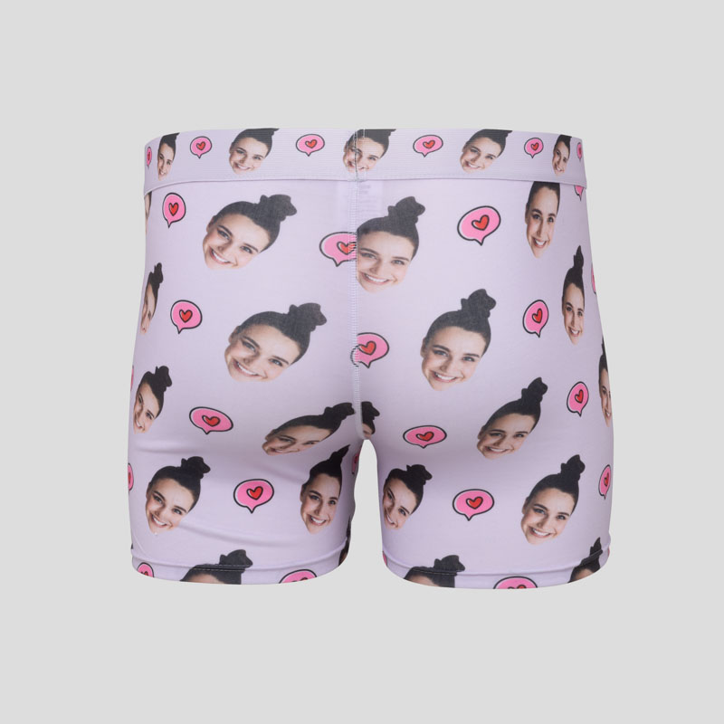 Ladies also love these custom boxers as they're perfect to wear as boy shorts. With such a simple cut and pattern, and sizes from XS to XL, girls look great and stylish in them too. You can create Mr and Mrs or His and Hers synchronised pairs of boxers shorts in our design system, or add a photo of your face on your partner's pair, and one of their face on yours, so you're always close to each other in a fun and cute way when you wear them.