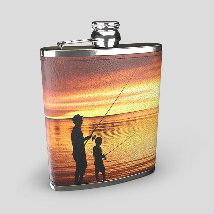 When you create your own personalised hip flask with photo, it is the leather wrap that you can customise. Once you've decided on who you'd love to gift a leather hip flask to, you can use our design interface to upload your photos, text or patterns. The design view will show where your design will end and highlight the safe and bleed areas of the sleeve. Be sure to keep all the important details central, that way they will appear on the front of the hip flask. Please note that as the sleeve is made with a single strip of leather, the ends will meet at the back. This means it's unlikely your designs will match at the seams, unless you create it this way. Use the 'product view' to see how your designs look at the seam on the back of the hip flask.