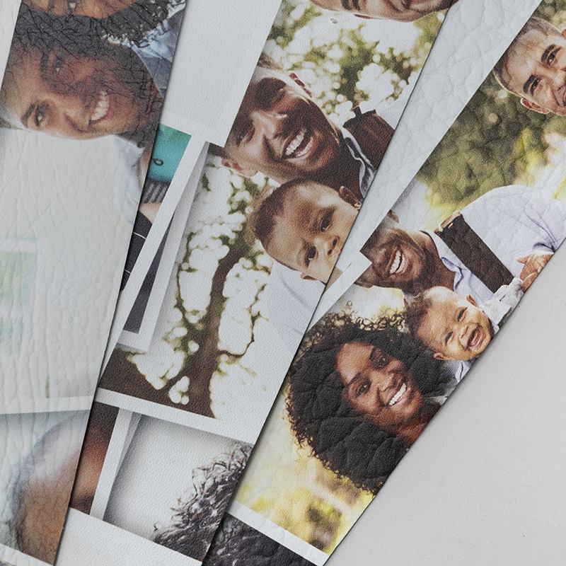 Your choice of Nappa leather or warm leatherette is digitally printed with your designs. The photo bookmark shapes are then cut out and stitched to your choice of coloured leather for the backing. Your personalised leather bookmark set is handmade and ready to be sent to you within two days.