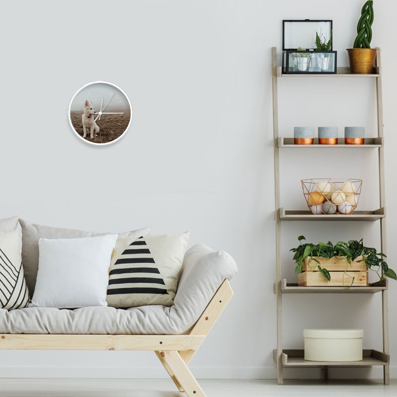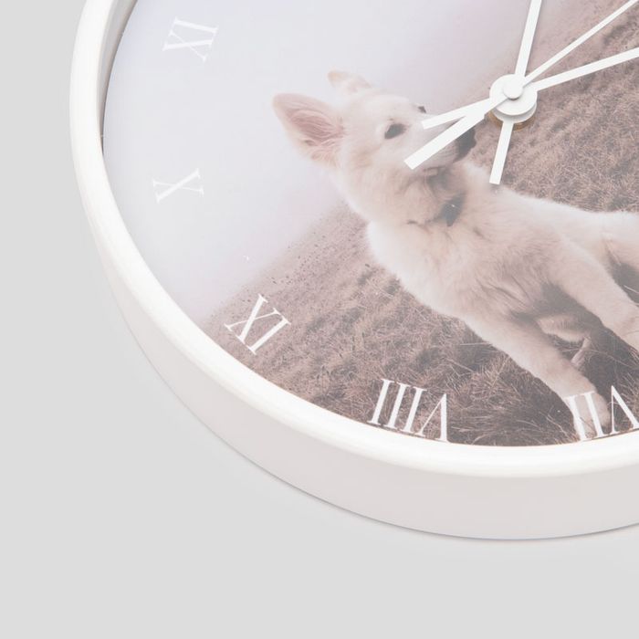 We print your design using advanced digital techniques for sharp, vivid colour before sealing it for a lasting finish. The face is then fitted with silent sweep movement, your chosen dial style and quality hands. Finally, we mount everything in your selected natural, white or black frame and add a keyhole hanger so it’s ready to go straight on the wall.