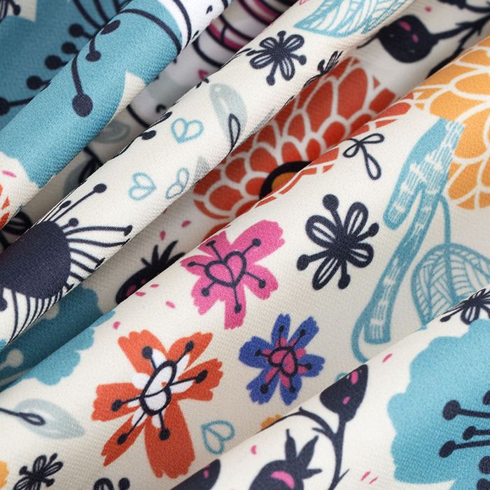 Light weight, soft with no stretch, matte and sheer, smooth. Super bright colours and deep blacks, strong wash fastness, using reactive ink chemistry. Expect shrinkage 1-2% weft, 3-4% warp.