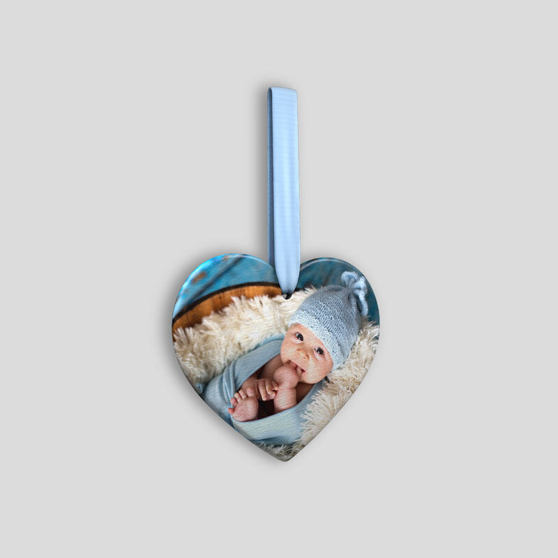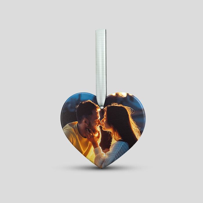 We use a 3D digital printing technique which infuses the eco-friendly inks deep into the surface, which results in a long-lasting print which will not peel or scratch off. Depending on your choice of ornament your photos will either have a gloss or a smooth satin finish with natural brushstrokes. There is a hole in the top centre of the ornament which is for the beautiful red ribbon to thread through so that you can hang your personalised heart shaped ornament.